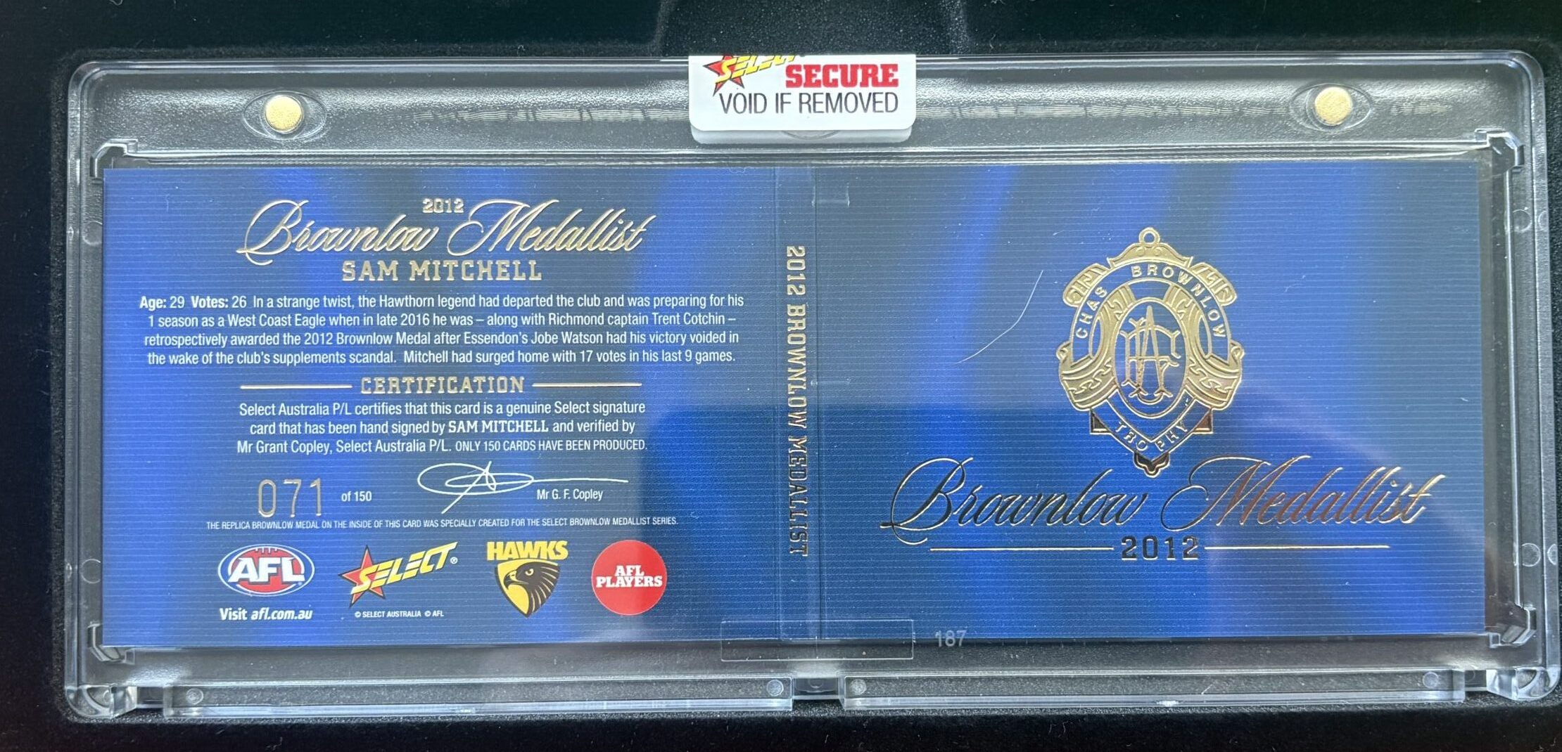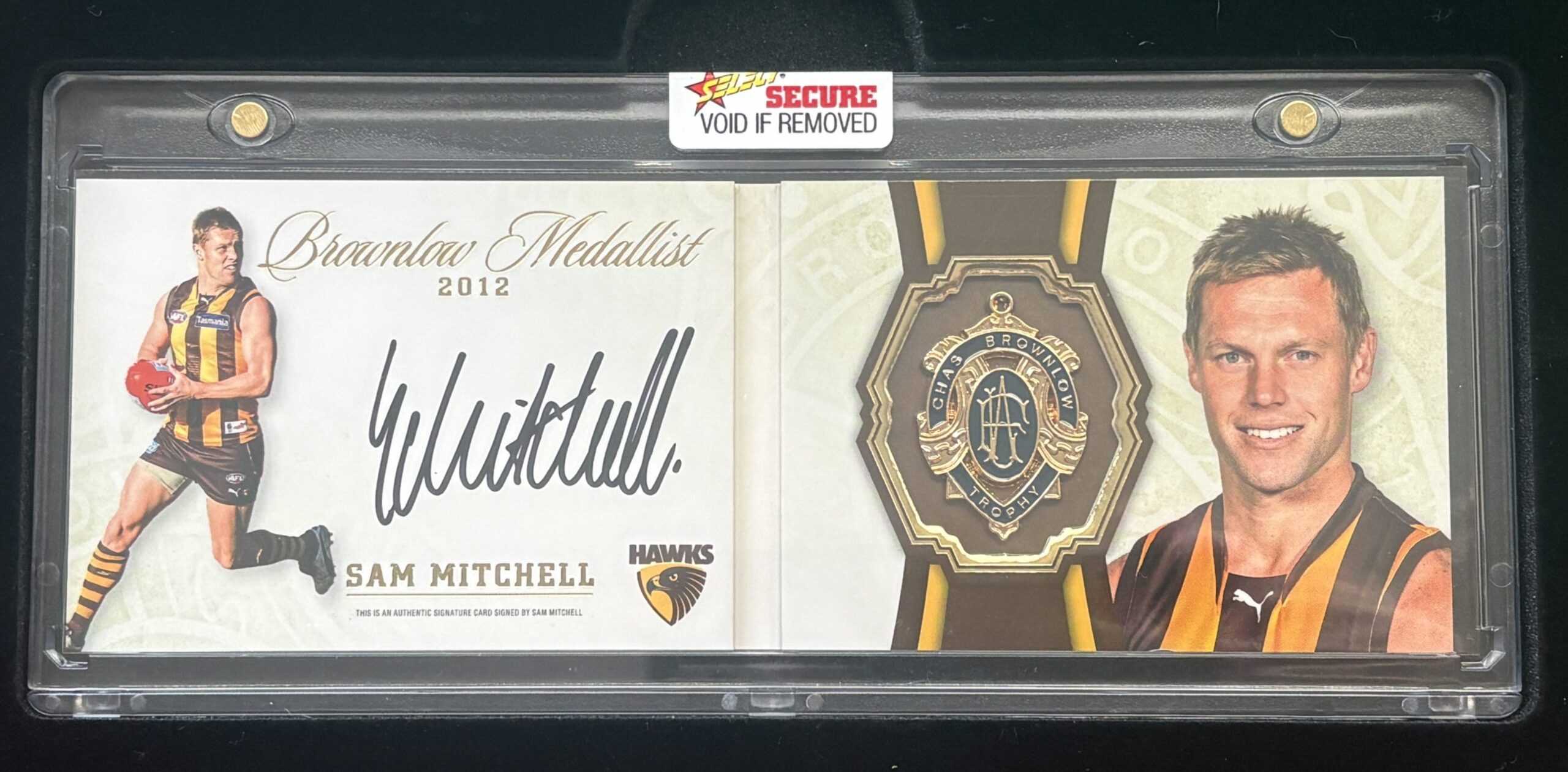 Celebrate Hawthorn legend Sam Mitchell’s stellar career with this rare 2024 Select Brownlow Medallist Series trading card. Limited to only 150 copies, this hard-signed autographed card showcases Mitchell in his iconic Hawthorn Football Club jersey. A must-have for any AFL memorabilia collector, this card is a prized possession for fans of Australian Rules Football and the Hawthorn Football Club.