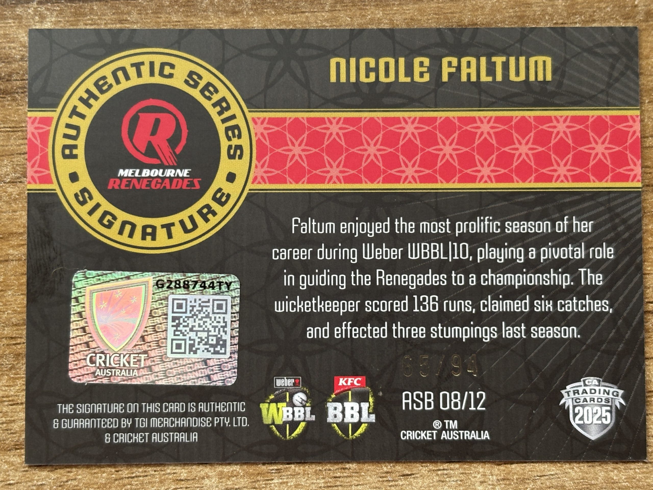 2025/26 CRICKET TRADERS AUTHENTIC SIGNATURE BLACK ASB08 NICOLE FALTUM #65/94
