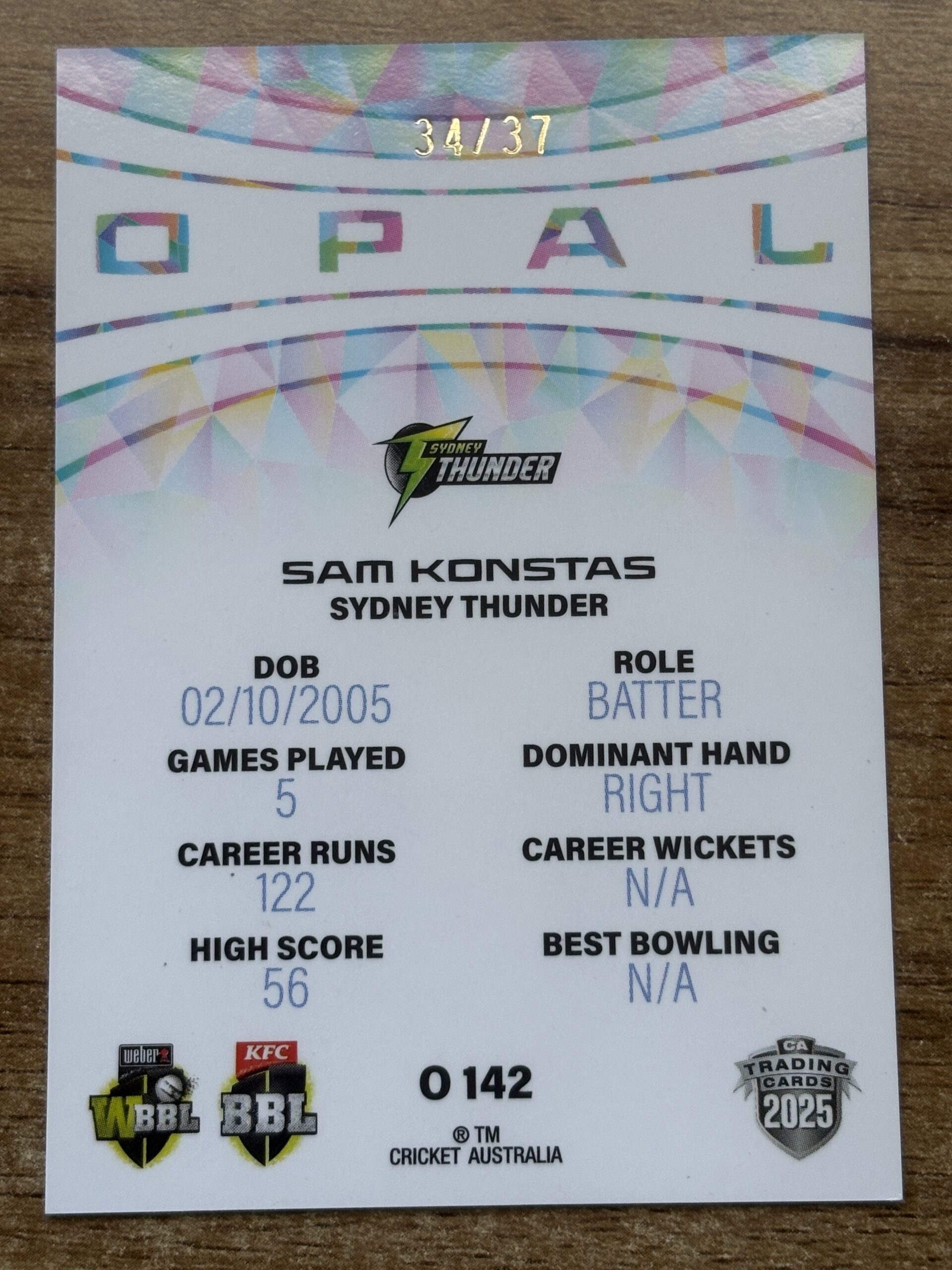 2025-26 Cricket Traders Mojo Opal White – Sam Konstas 34/37