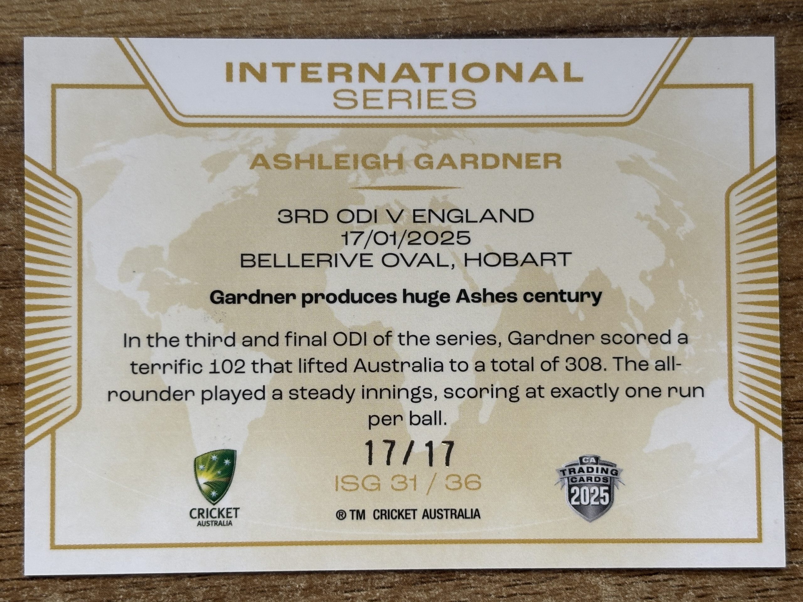 2025-26 TLA CRICKET TRADERS-PRIORITY INTERNATIONAL SERIES-ASHLEIGH GARDNER-#17/17.BOOKEND.
