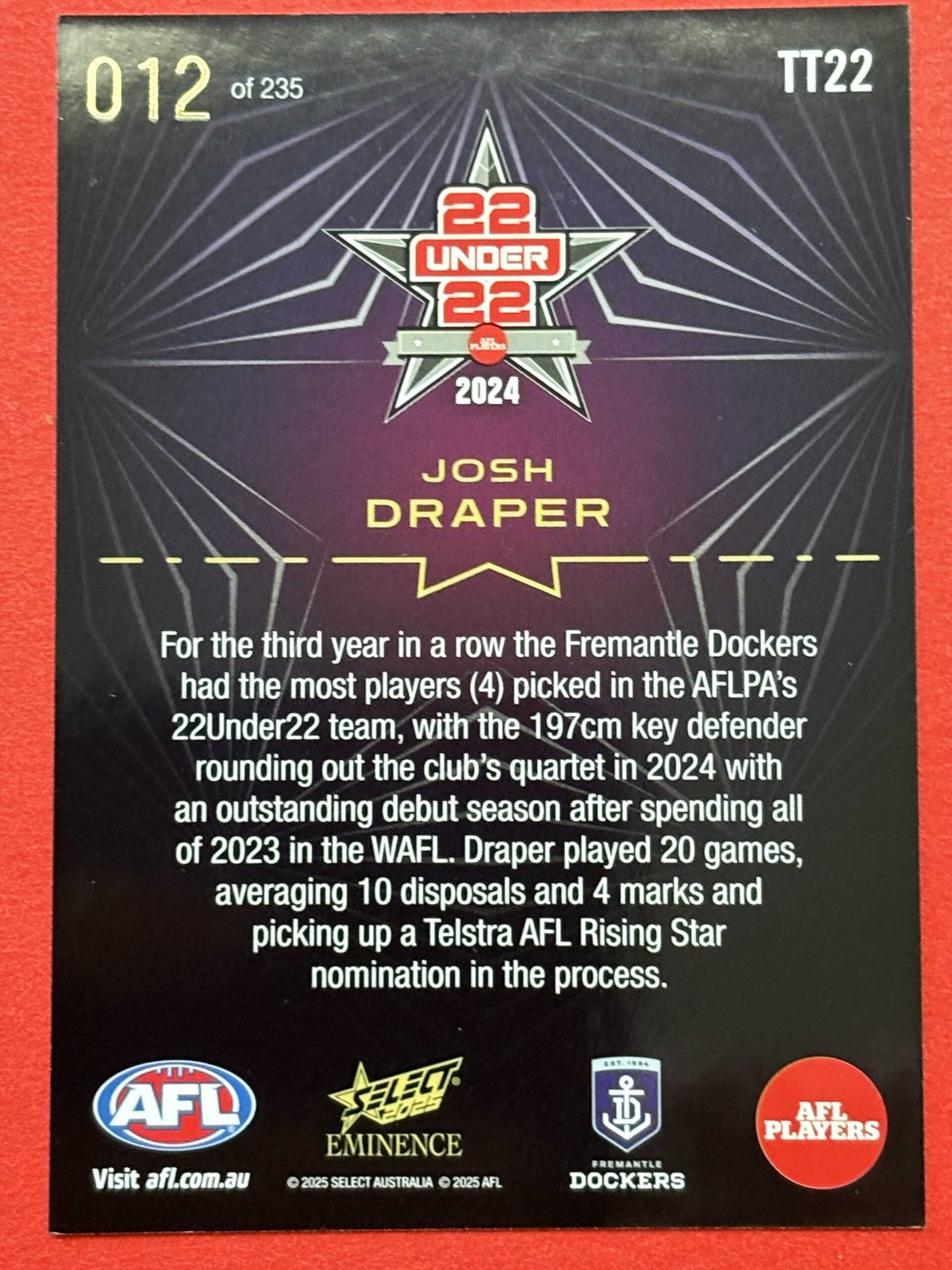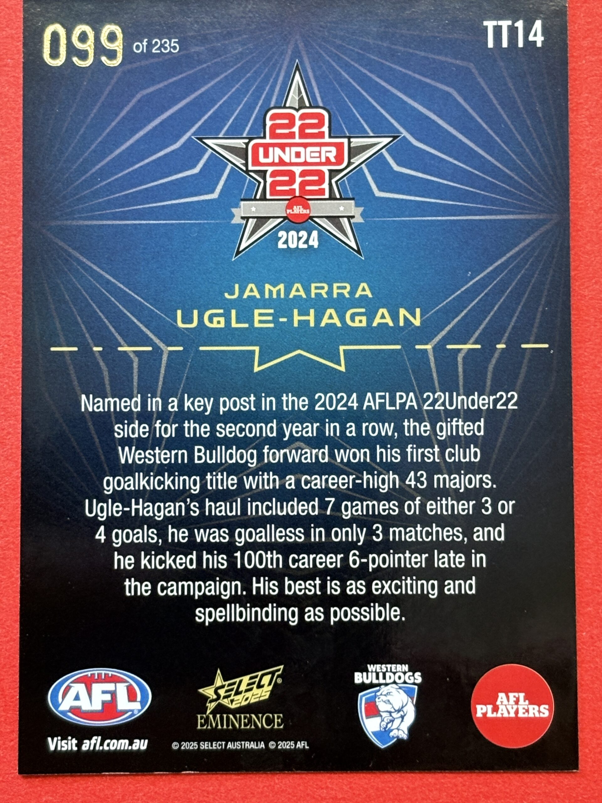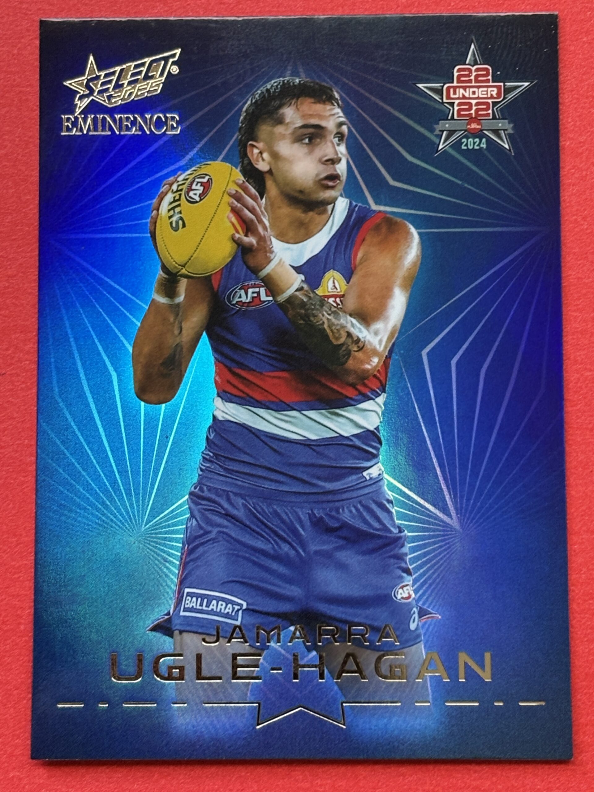 Capture a piece of the on-field action with the 2025 AFL Select Eminence 22 Under 22 card featuring certain cards like Western Bulldogs’ rising star Jamarra Ugle-Hagen. These limited edition collectibles showcase the promising talent in his debut season and is a must-have for any dedicated AFL supporter or AFL memorabilia collector. Meticulously crafted by Select, the card celebrates the essence of Australian Rules Football and is a tribute to the athlete’s hard work and skill. As part of the highly sought-after 2025 series, it’s an exceptional find for those looking to commemorate the sport and its stars in the making.