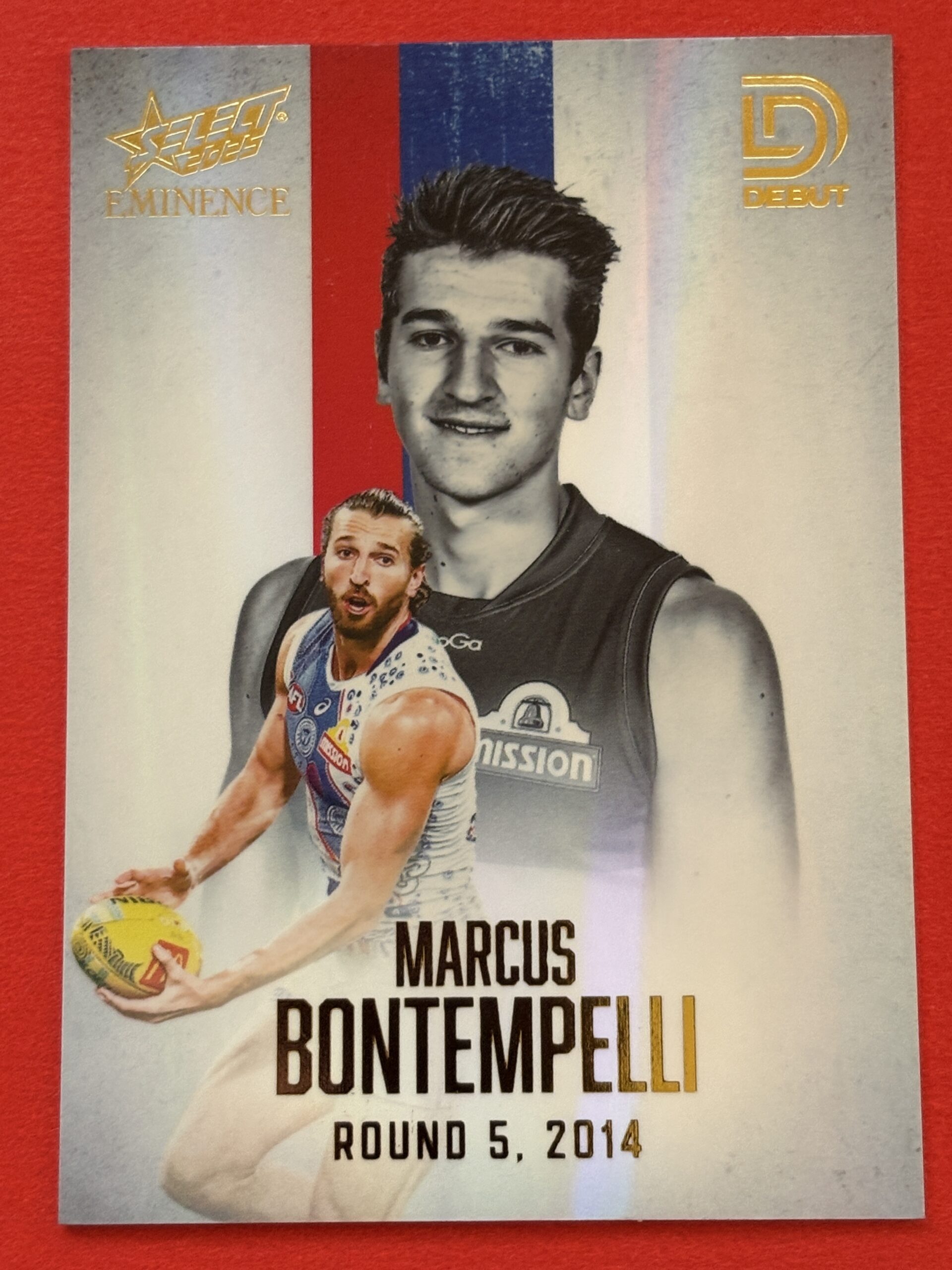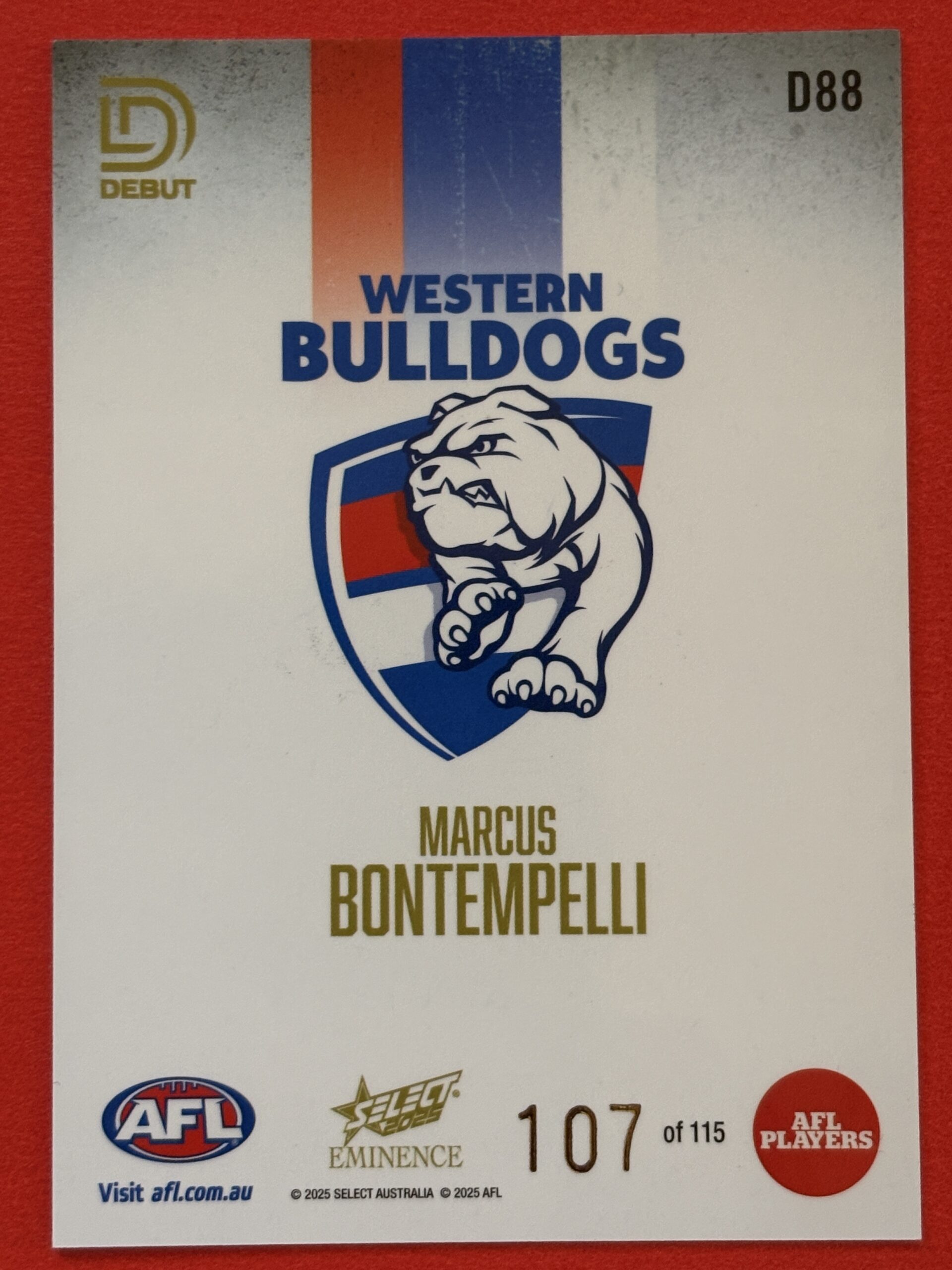 Capture a piece of Australian Football history with the 2025 AFL Select Eminence Debut Card featuring the rising star Marcus Bontempelli of the Bulldogs. This limited edition card, numbered #107 out of just 115, is a coveted collectible for any fan of the sport or card enthusiast. The gold parallel variety adds an exclusive touch to your collection, celebrating the athlete’s entry into the AFL. Autographed by Bontempelli himself, the card is a testament to his growing legacy within the Australian Football League. Produced by Select, a trusted name in sports memorabilia, this card is a must-have for those looking to commemorate the journey of a Bulldog’s journey from promising rookie to AFL icon.