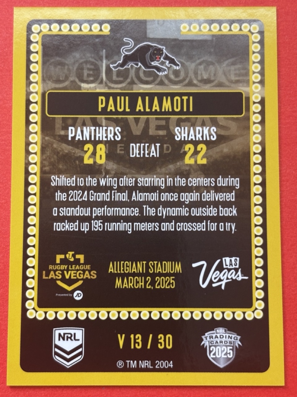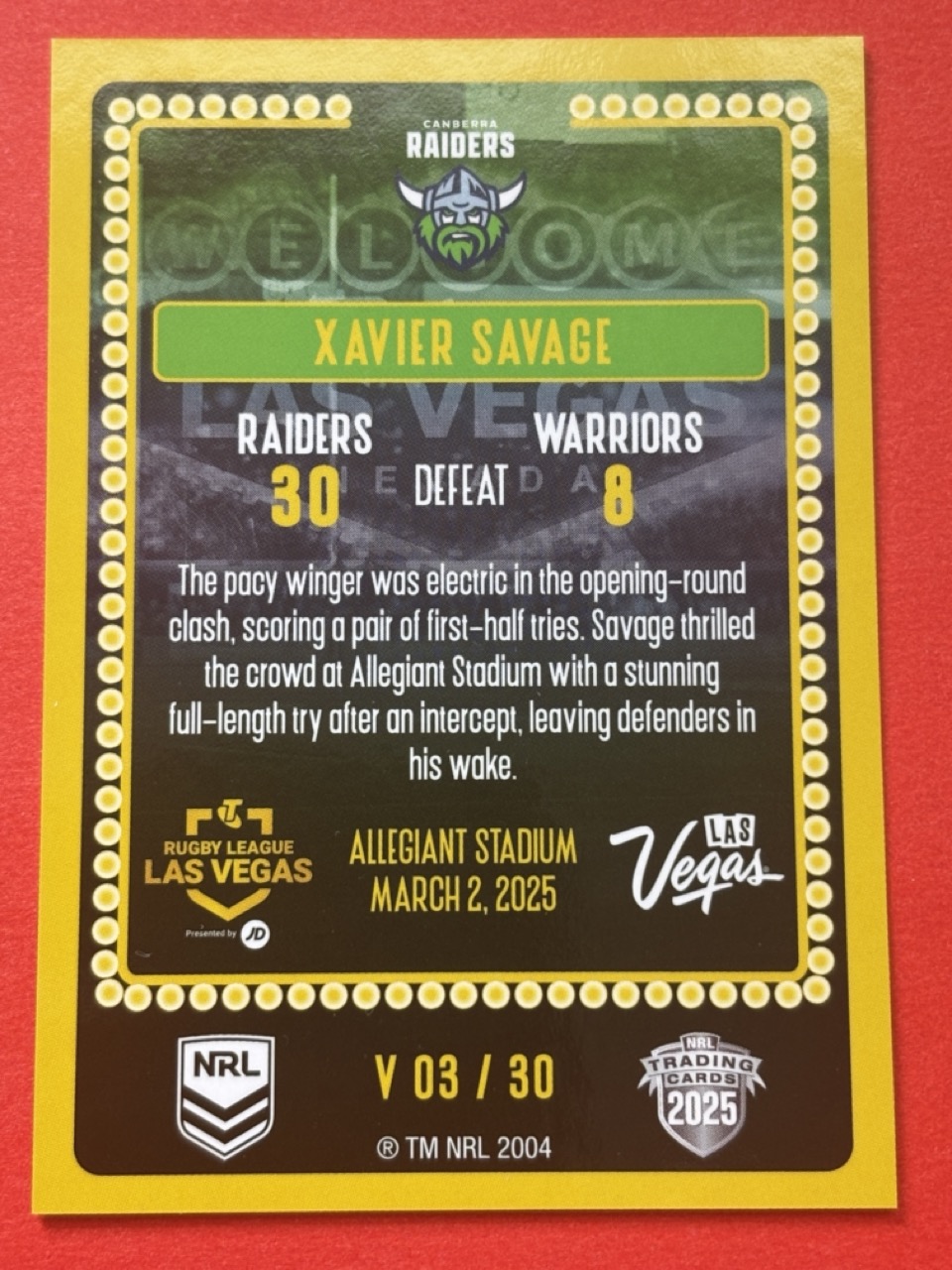 Capture the excitement of the 2025 NRL Elite Las Vegas event with our selection of sports trading cards. Choose from the dropdown menu to find the perfect card to add to your collection or gift to a fellow Rugby League enthusiast. Each card showcases the energy and passion of the game, making it a fantastic memento for any fan. Our trading cards are produced with high-quality images and detailed statistics of the players featured, providing a true-to-form collectable experience. Whether you’re a seasoned collector or just starting out, these cards are a must-have to celebrate the spirit of Rugby League. Please note, the condition of the cards is near mint (NM).