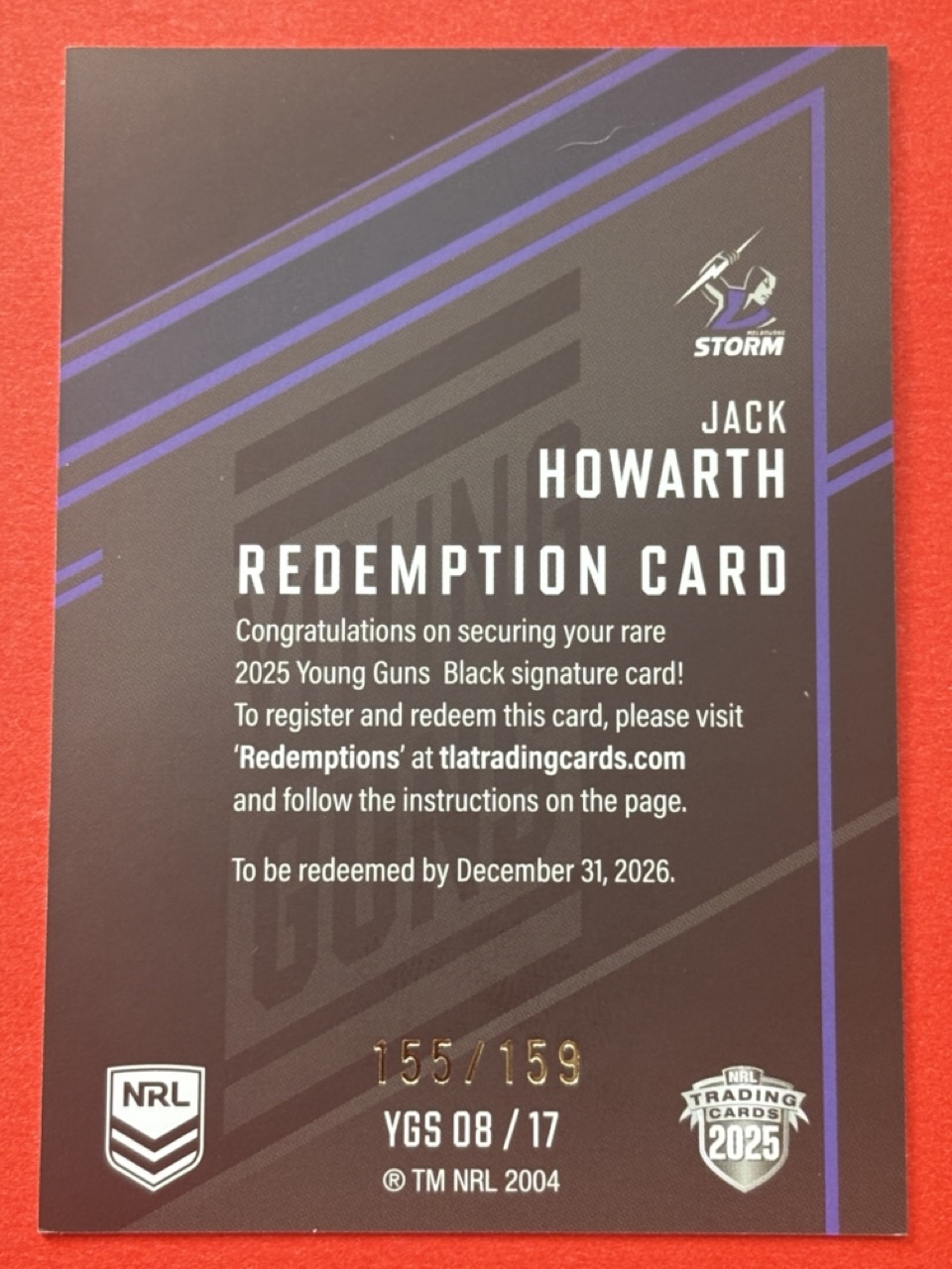 2025 Nrl Elite-Young Guns-Black Signature-(YGS08)-Jack HOWARTH-Storm-155/159