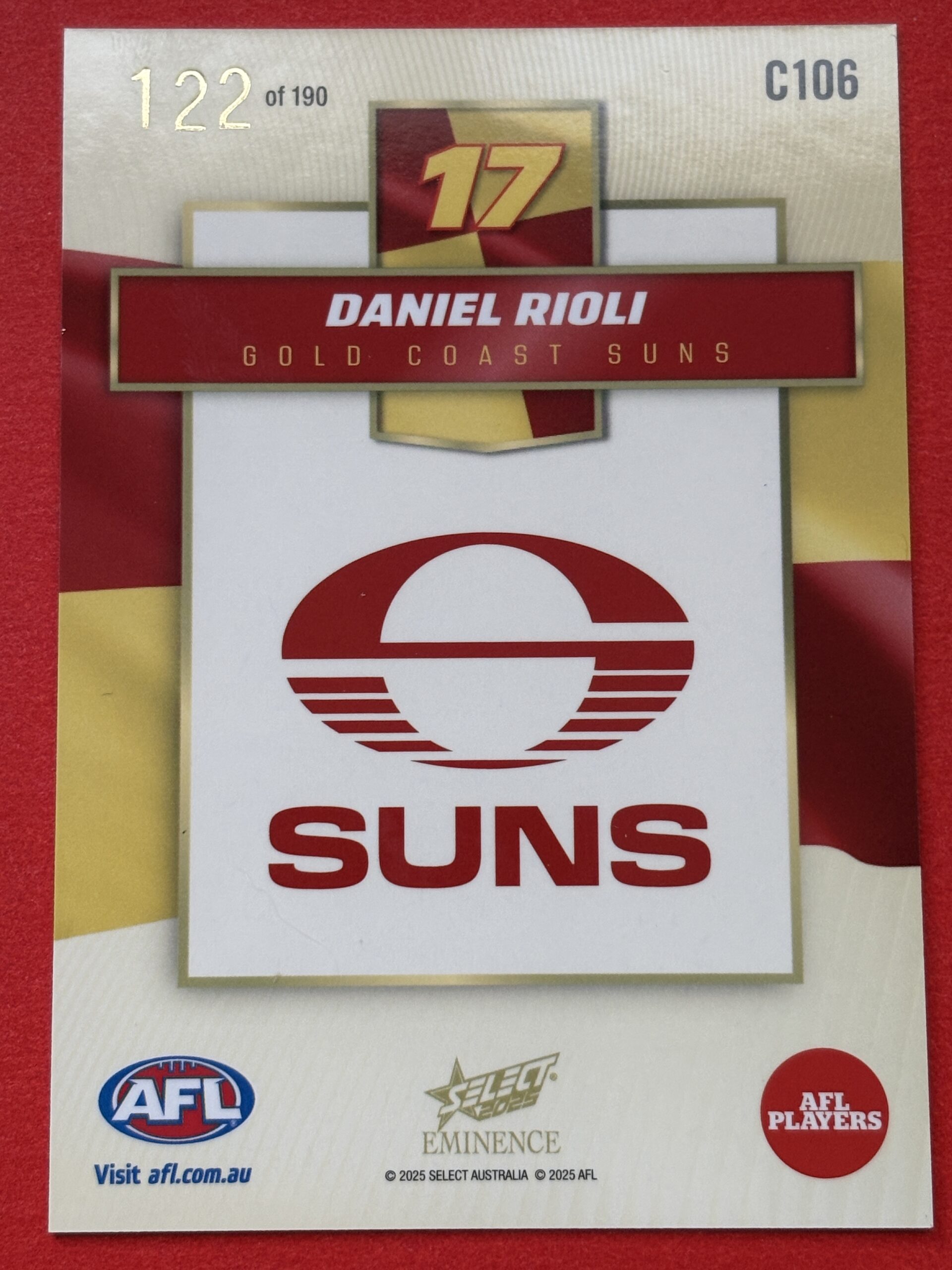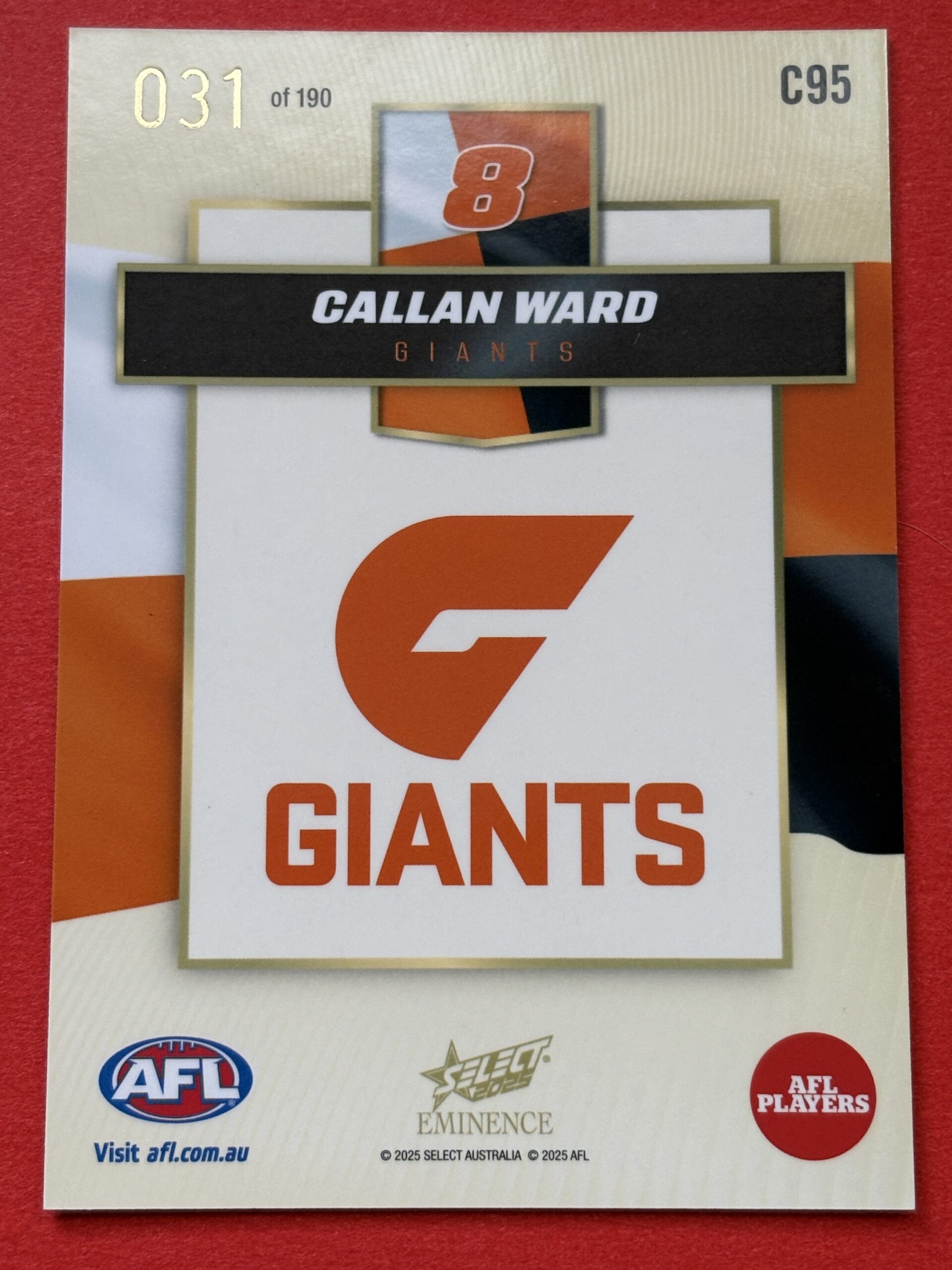 Capture a piece of AFL history with the 2025 Select AFL Eminence Colours card featuring players like Callan Ward of the Greater Western Sydney Giants. These limited edition collectibles are a must-have for any serious collector or fan of the sport. It celebrates the vigour of Australian Football and the legacy of one of the league’s rising stars. Crafted by Select, a trusted name in sports memorabilia, this sports trading card belongs to the exclusive 2025 Select set, capturing the essence of the game and the athlete’s prowess on the field. Add this piece of AFL pride to your collection and own a snapshot of the sport’s ongoing saga.