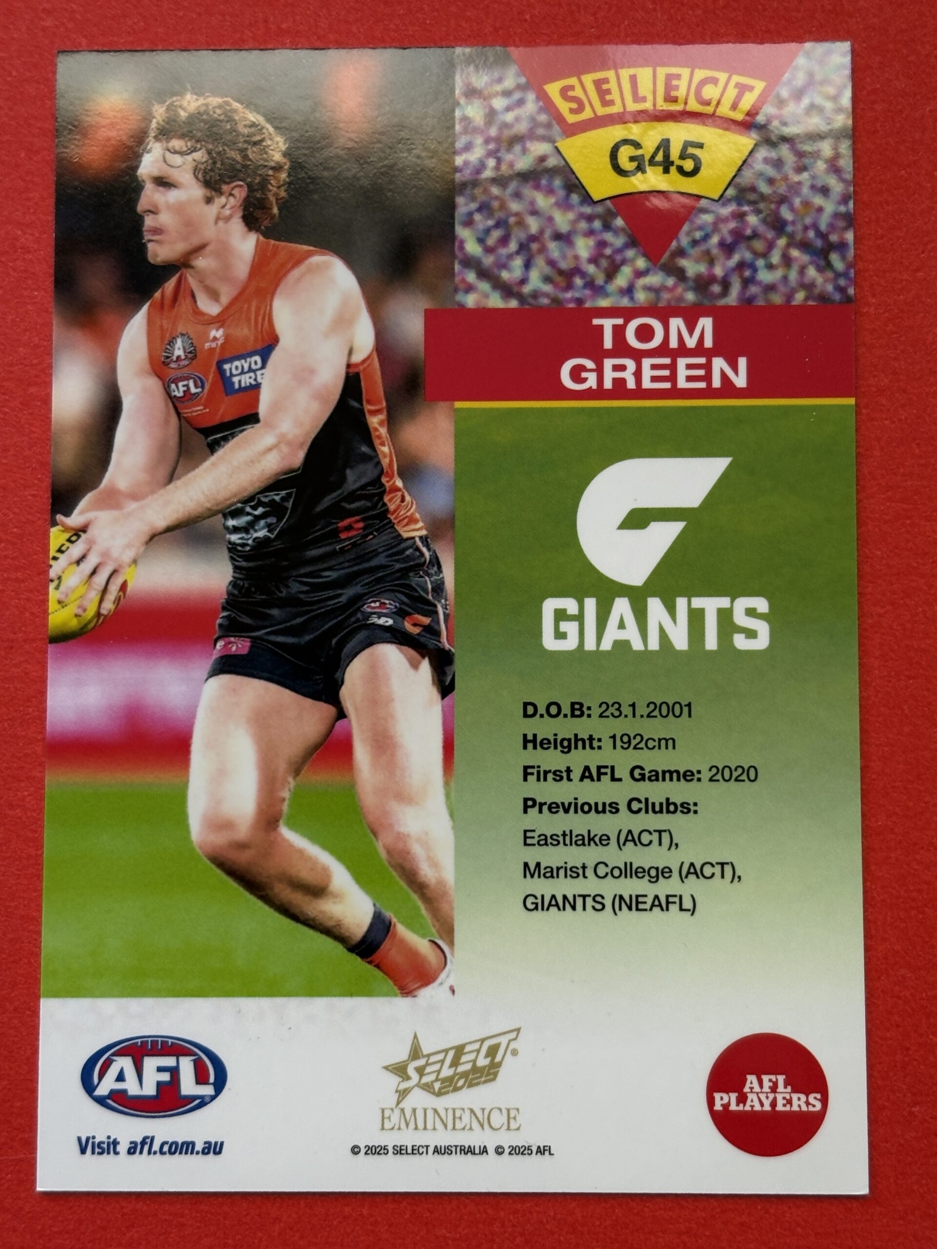 Capture a piece of AFL history with this exclusive 2025 Select AFL Eminence Gold Series card featuring Tom Green of the GWS Giants. This limited edition collectible, numbered 13 out of 50, is a must-have for any serious collector or fan of the sport. Showcasing the Greater Western Sydney Giants’ pride and the athletic prowess of Tom Green, this card is a true representation of Australian Football. Crafted with care by Select, the renowned manufacturer of sports memorabilia, this card belongs to the prestigious 2025 Select set, Parallel/Variety: Gold Green. It celebrates the spirit of the Australian Football League and is an iconic addition to any AFL collection. Whether for display or as an investment, this trading card holds the allure of the game and the excellence of its players.