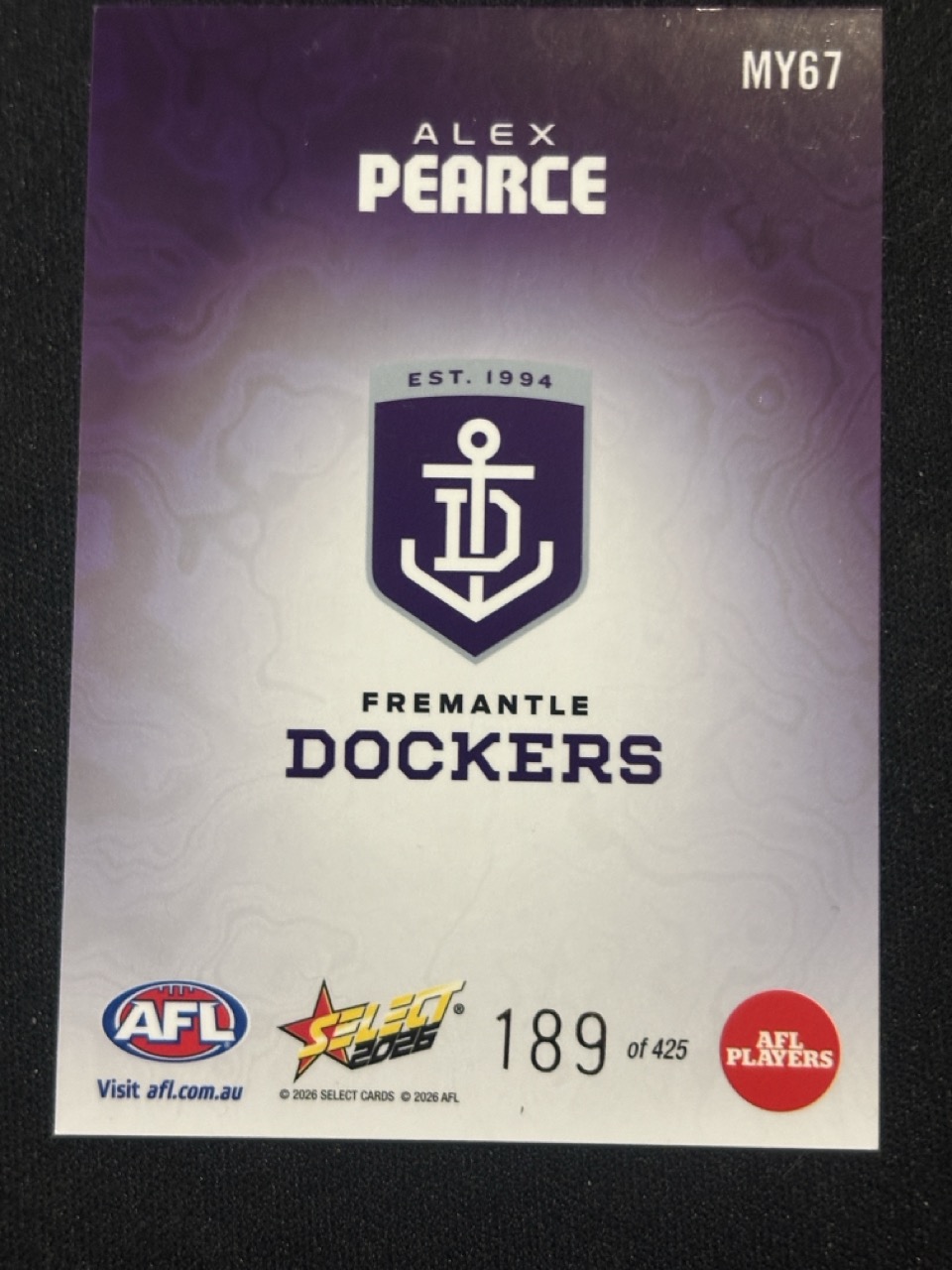 Capture a slice of AFL history with this exclusive 2026 AFL Footy Stars card featuring the talented Alex Pearce of the Dockers. Proudly presenting the Mercury Colours design, this card is numbered 189 out of 425, ensuring its uniqueness and collectability. A must-have for any footy enthusiast, it showcases the player in action during the memorable MY67 season. Crafted with precision by Select, the renowned card manufacturer, this sports trading card is a testament to Australian Football. It’s a part of the prestigious 2026 Select series, celebrating the athleticism and spirit of the game. The card is produced in Australia, retains its originality, and is not autographed, preserving the authentic feel of the sport.