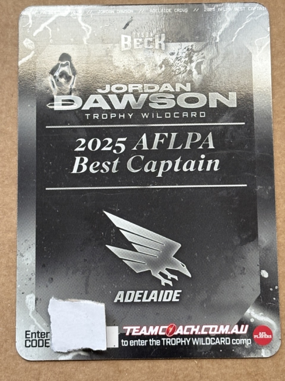 Capture a piece of AFL history with the 2026 AFL Teamcoach Trophy Wildcard featuring Steele Sidebottom, the 2025 Anzac Day Medallist. This collectable card, number TW-10, is a must-have for any Australian Rules Football enthusiast or card collector. With its sleek silver parallel/variety finish, it’s a standout piece representing the sporting excellence and dedication of one of the AFL’s finest athletes. Proudly manufactured in Australia, this card is a part of the 2026 Teamcoach set and is presented in standard card size with a 35 Pt. thickness, ensuring durability and a classic feel. While it’s not autographed, its originality and the fact that it commemorates the Anzac Day spirit make it a valuable and memorable addition to any collection.