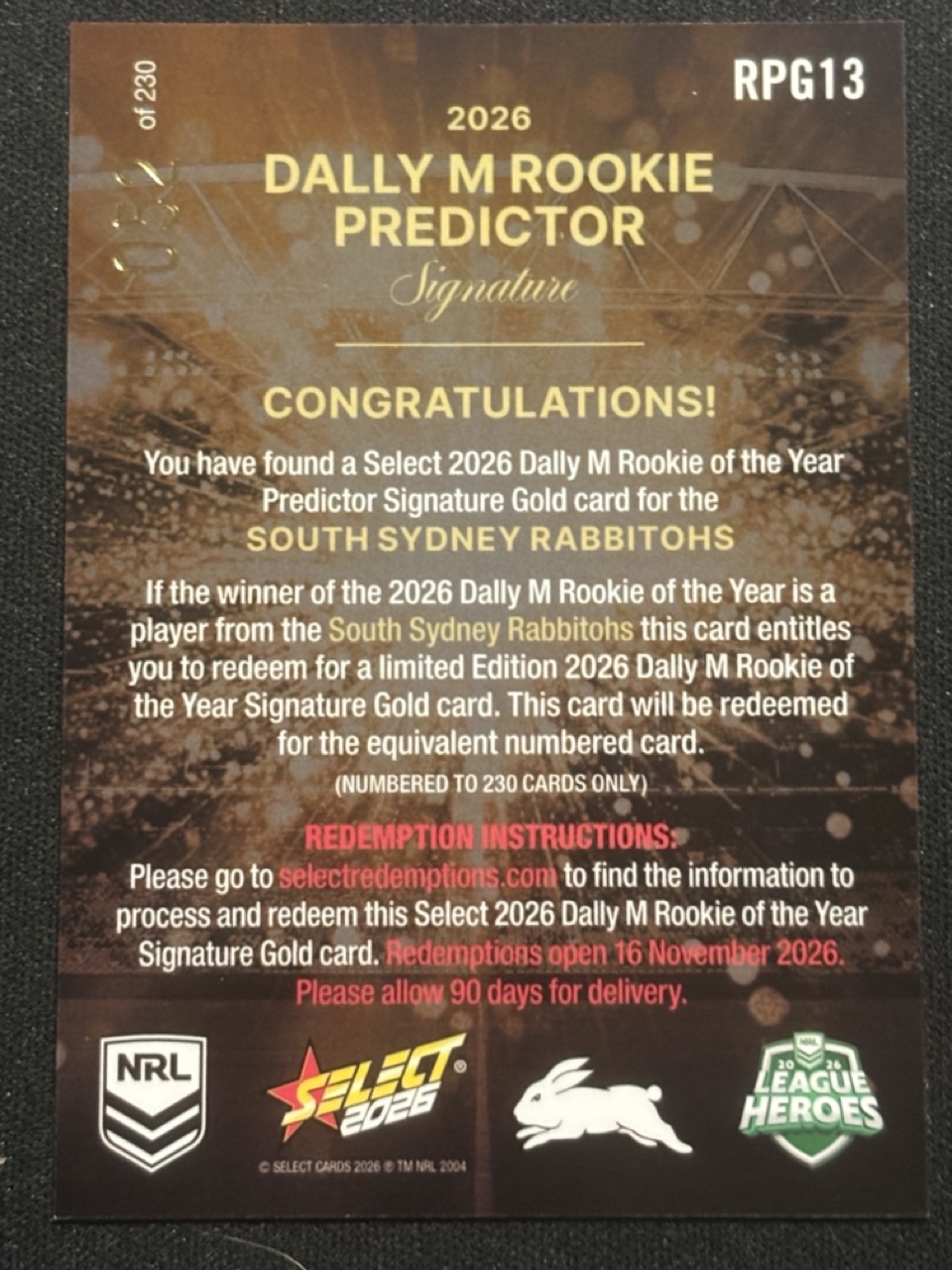 Capture a piece of NRL history with the 2026 League Heroes Dally M Rookie Signature Predictor card, featuring the Rabbits’ rising star. This limited edition collector’s item, numbered #052/230, celebrates the athlete’s debut season with a sleek design and the prestige of a Rookie Signature Parallel. Crafted by Select, a trusted name in sports memorabilia, this card is a must-have for any serious collector or fan of the sport. It pays homage to the player’s early career and is a unique addition to any NRL collection, capturing the essence of the National Rugby League’s vibrant heritage.