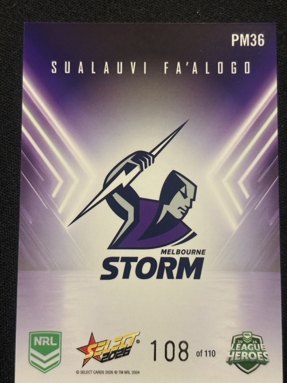 Capture a piece of NRL history with the 2026 Select NRL Heroes Playmakers Card featuring Suaulu Auva’a Fa’alogo. This limited edition collectible, numbered 108 out of 110, is a must-have for any serious collector or fan of the game. Proudly produced by Select, this card celebrates the prowess and skill of one of NRL’s most exciting players. From the 2026 Select series, this card is a tribute to the athletes who make the National Rugby League a thrilling spectacle. Perfect for displaying in your collection or gifting to a fellow enthusiast, it’s a unique piece of memorabilia that encapsulates the spirit and passion of NRL.