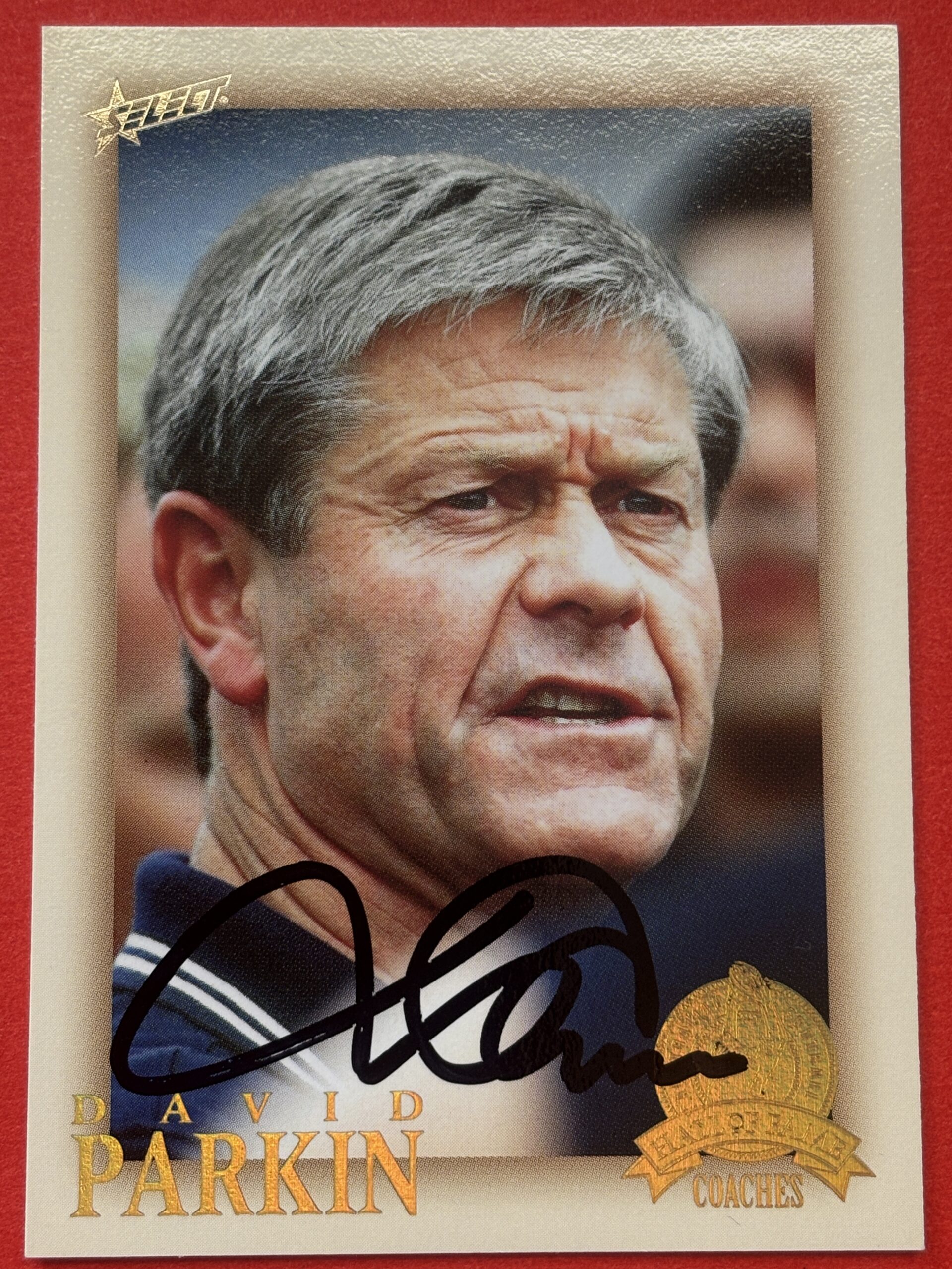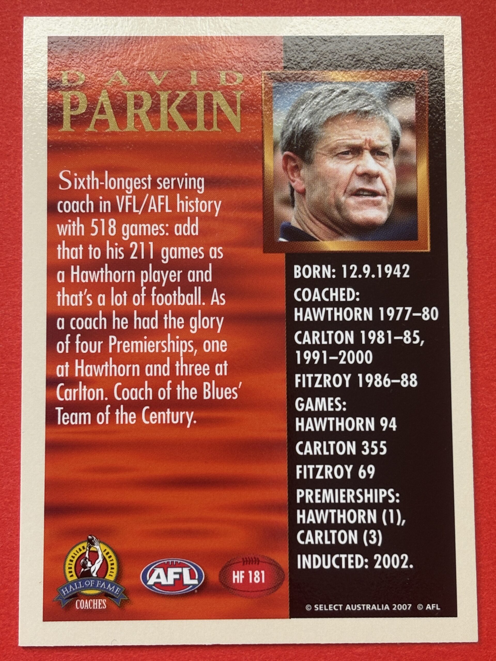 Celebrate a piece of Australian Football history with this David Parkin signed AFL Select 2007 Hall of Fame card. A treasured collectible for any Carlton Blues fan, the card honours the legendary player’s induction into the Australian Football Hall of Fame. With its striking blue parallel/variety, it’s a standout addition to any sports memorabilia collection. Crafted by Select, a trusted name in sports collectibles, this card captures the essence of the sport and its storied heritage. The signature of David Parkin adds a personal touch, making it a unique and valuable item for enthusiasts and collectors alike. Cherish the legacy of one of Carlton’s most celebrated heroes.