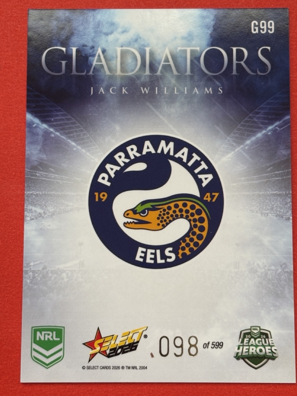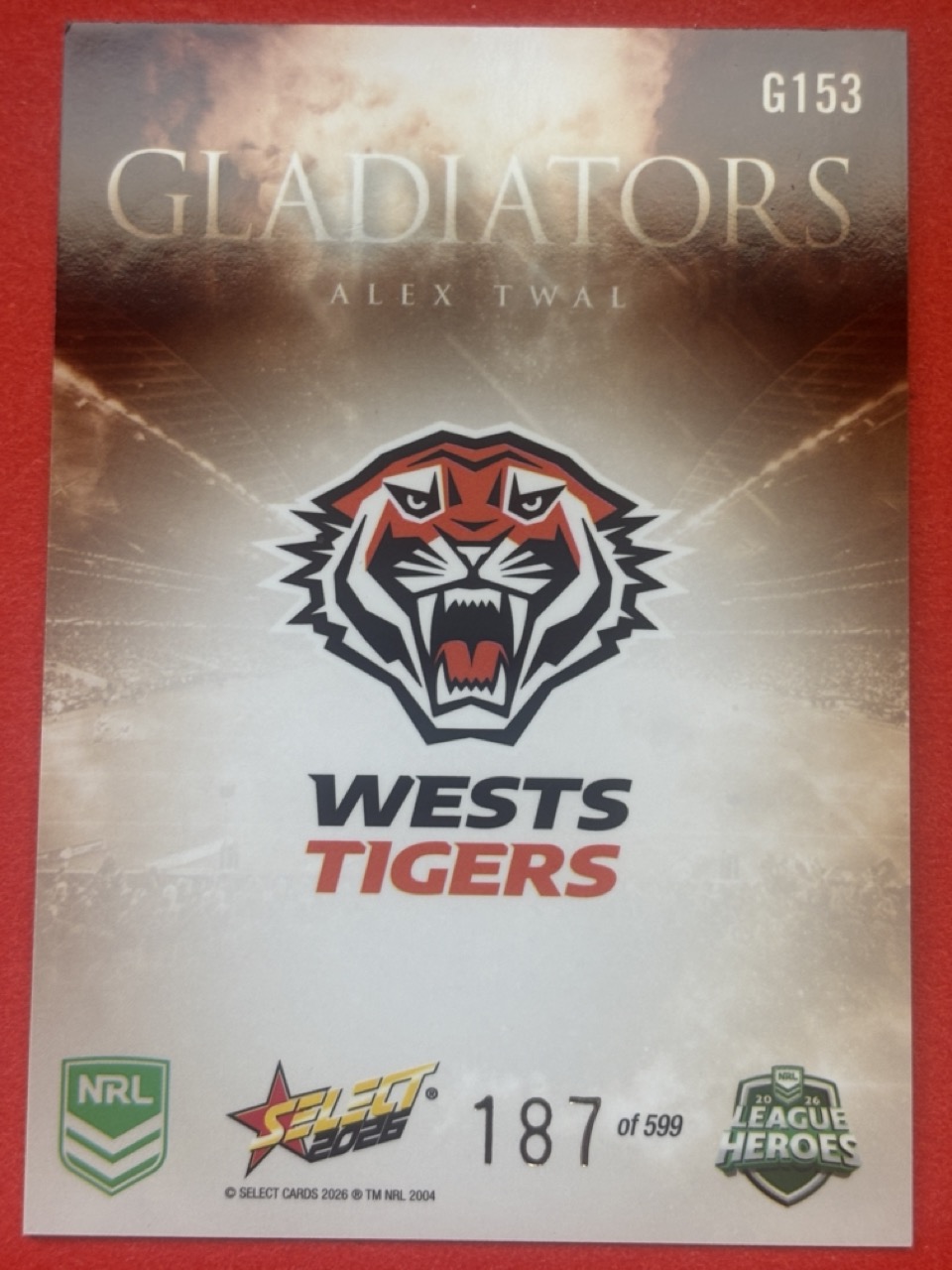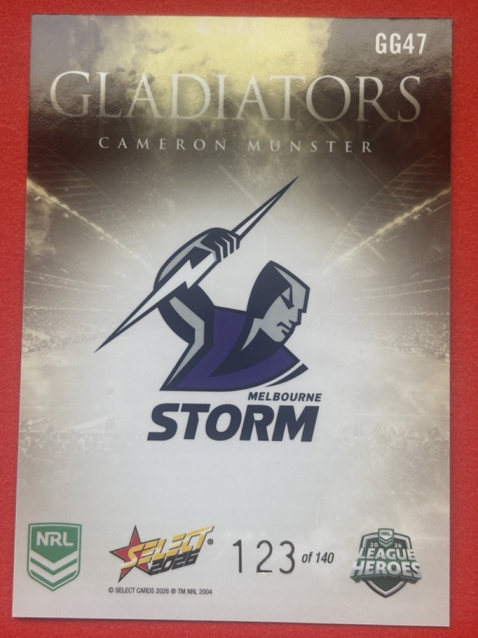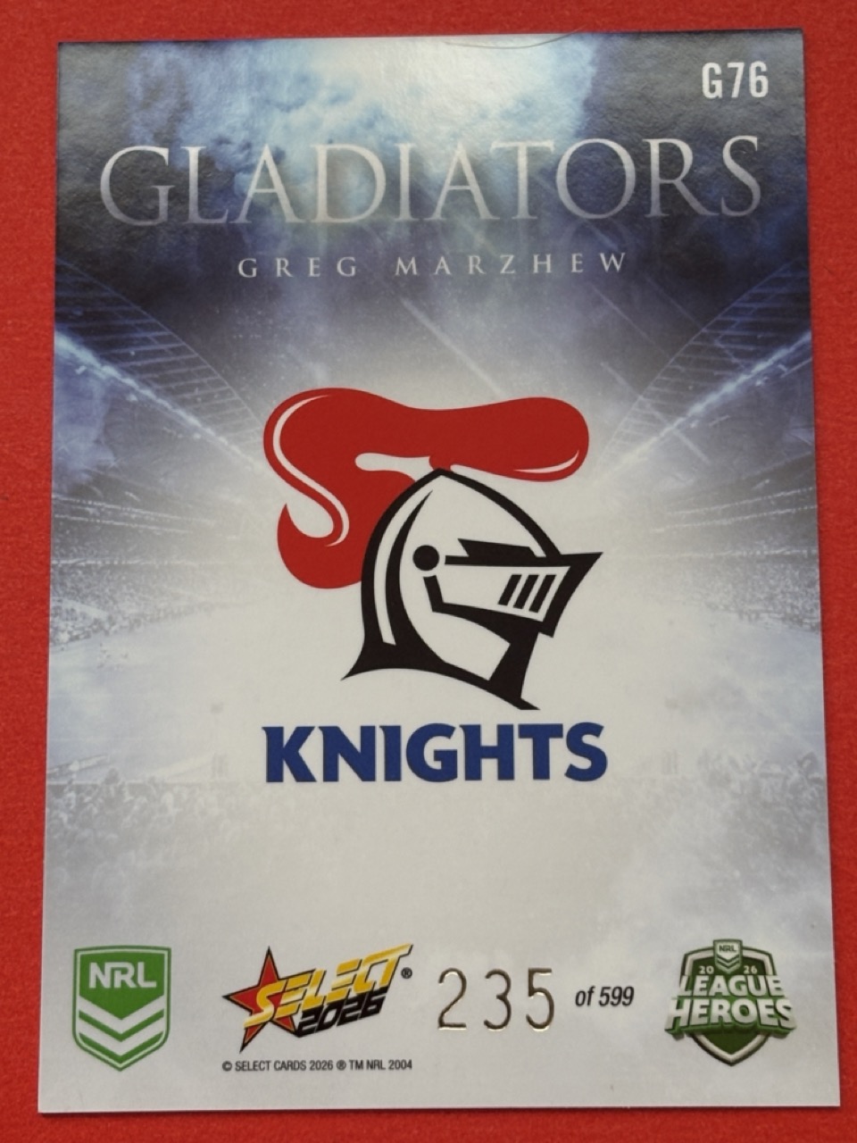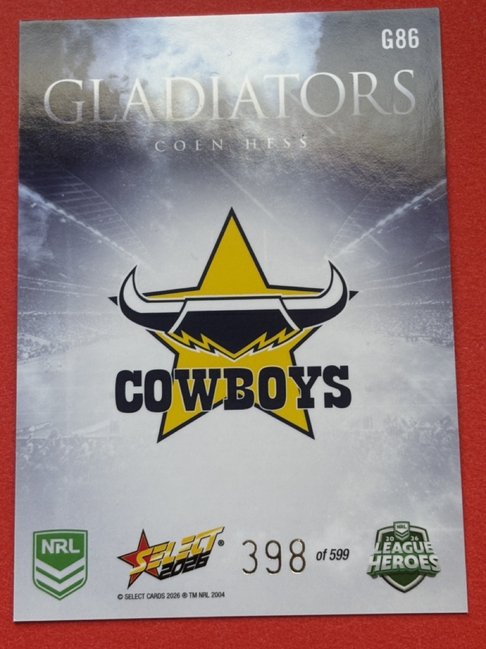 Elevate your NRL collection with the 2026 League Heroes-Gladiators card, a must-have for any die-hard Rugby League enthusiast. Featuring a striking design, this single card captures the essence of the game’s most thrilling moments and celebrated players. Select yours from the dropdown list to add to your personal anthology of League memorabilia. With the quality assured, this card is a tribute to the Heros League, embodying the spirit and passion of the sport. Whether for display or trade, it’s a timeless piece that commemorates the legacy and ongoing legacy of NRL. Choose your card wisely and own a piece of Rugby League history.