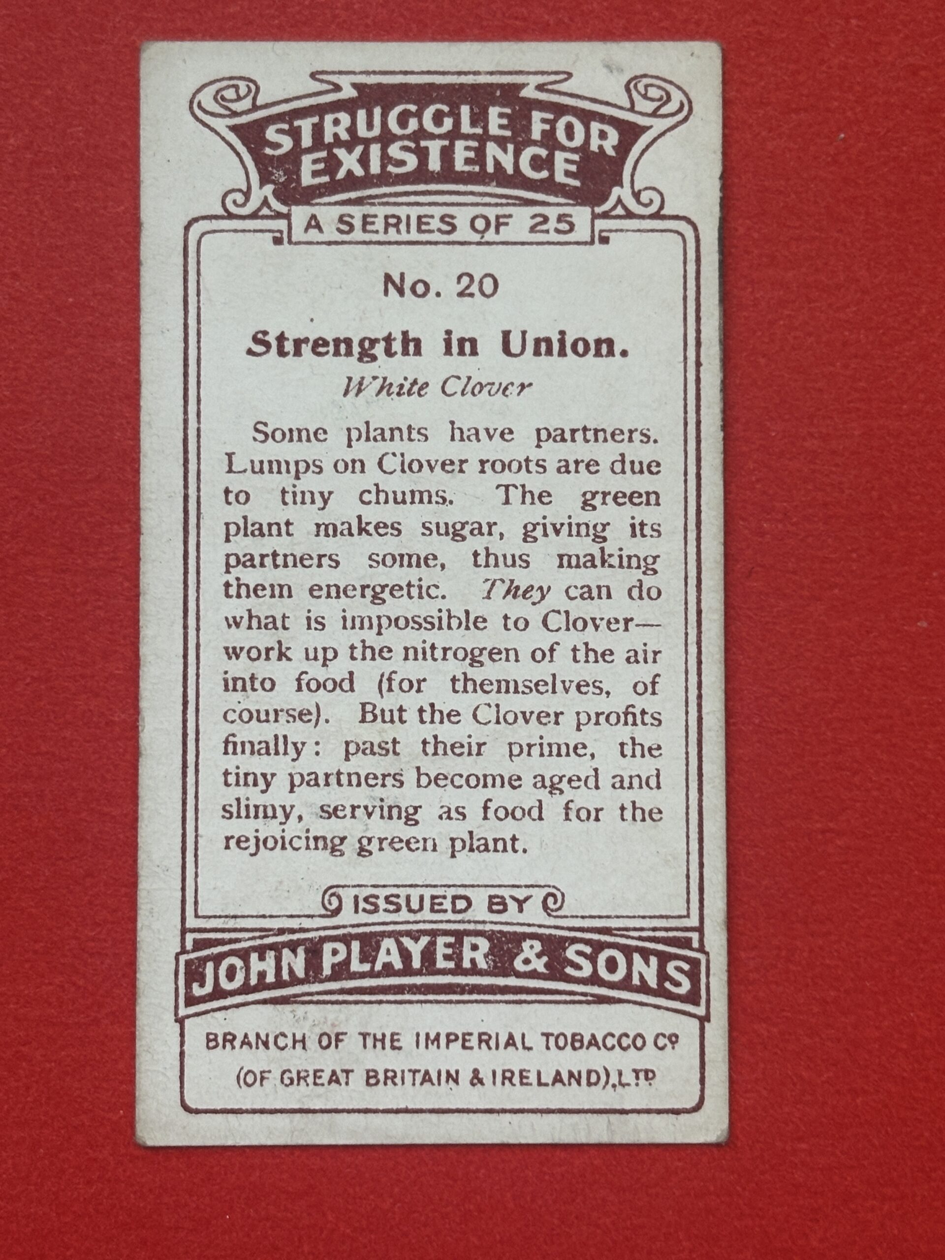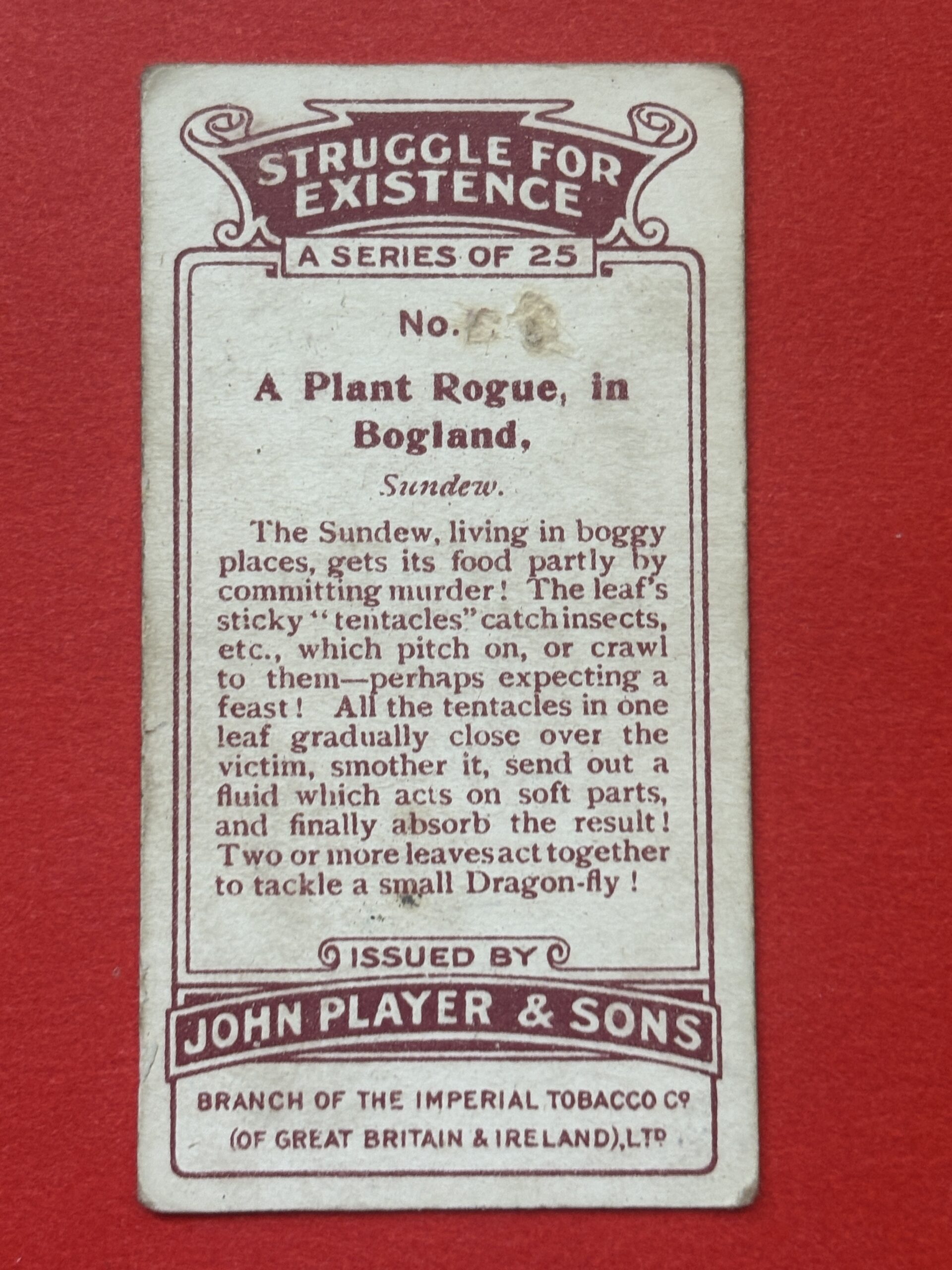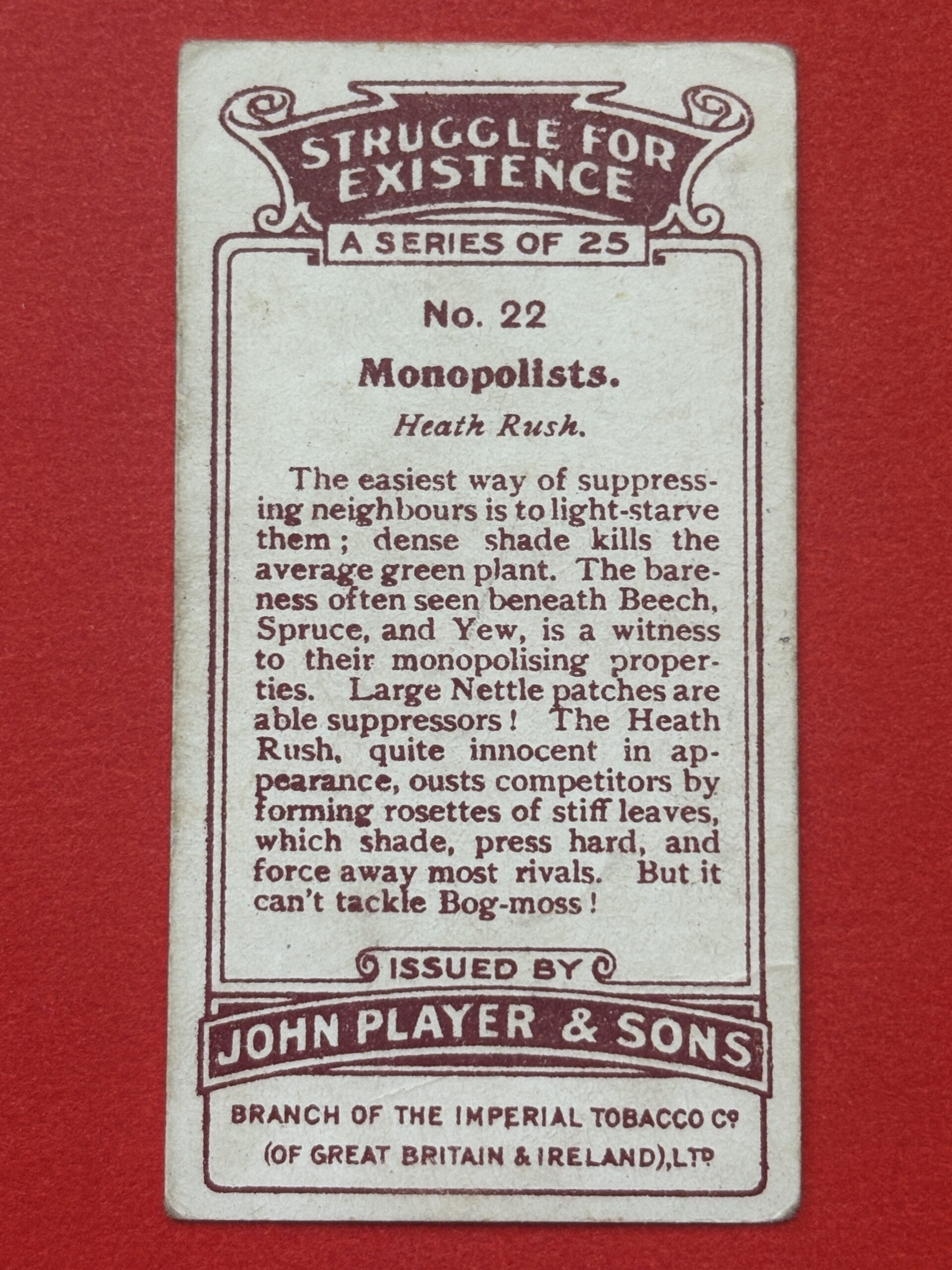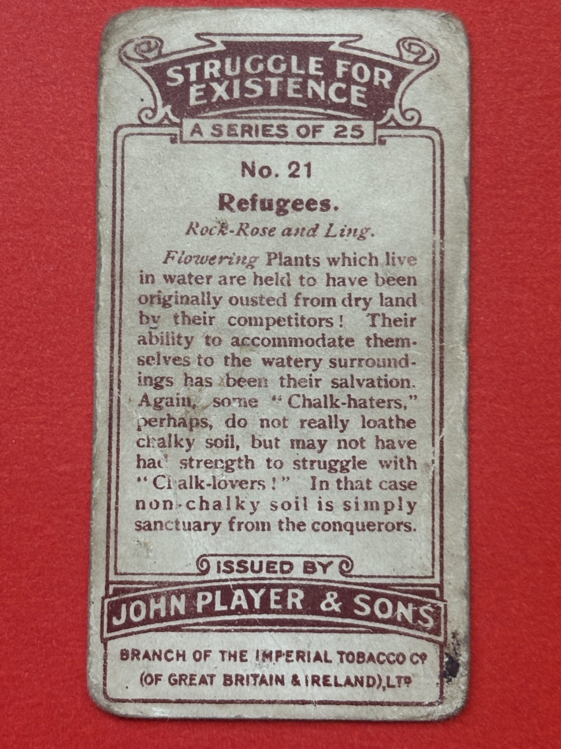 Explore the historical intricacies with our vintage cig card collection featuring the ‘Struggle for Existence’ set. A product of 1923, these tobacco-sized cards are a unique piece of history, each one a single card release by John Player and Sons. They are a tangible connection to the past, showcasing a glimpse of the era’s botanical wonder and the fierce competition inherent in nature, as depicted by the ‘Struggle for Existence’ theme. Collectors and enthusiasts can choose their specific card from the dropdown menu, each one an original piece with its own narrative to tell. Written in English, these cards are a testament to the artistic and historical value of the era, making them a must-have for any serious collector or history aficionado looking to add a piece of the past to their collection.QUALITY AVE TO POOR.CHECK IMAGES FRONT AND BACK.ON MULTIPLE ITEMS FOR SAME CARD,THE WORSE CARD WILL BE SHOWN.CAN SEND PIC OF CARD/S I WILL SEND.