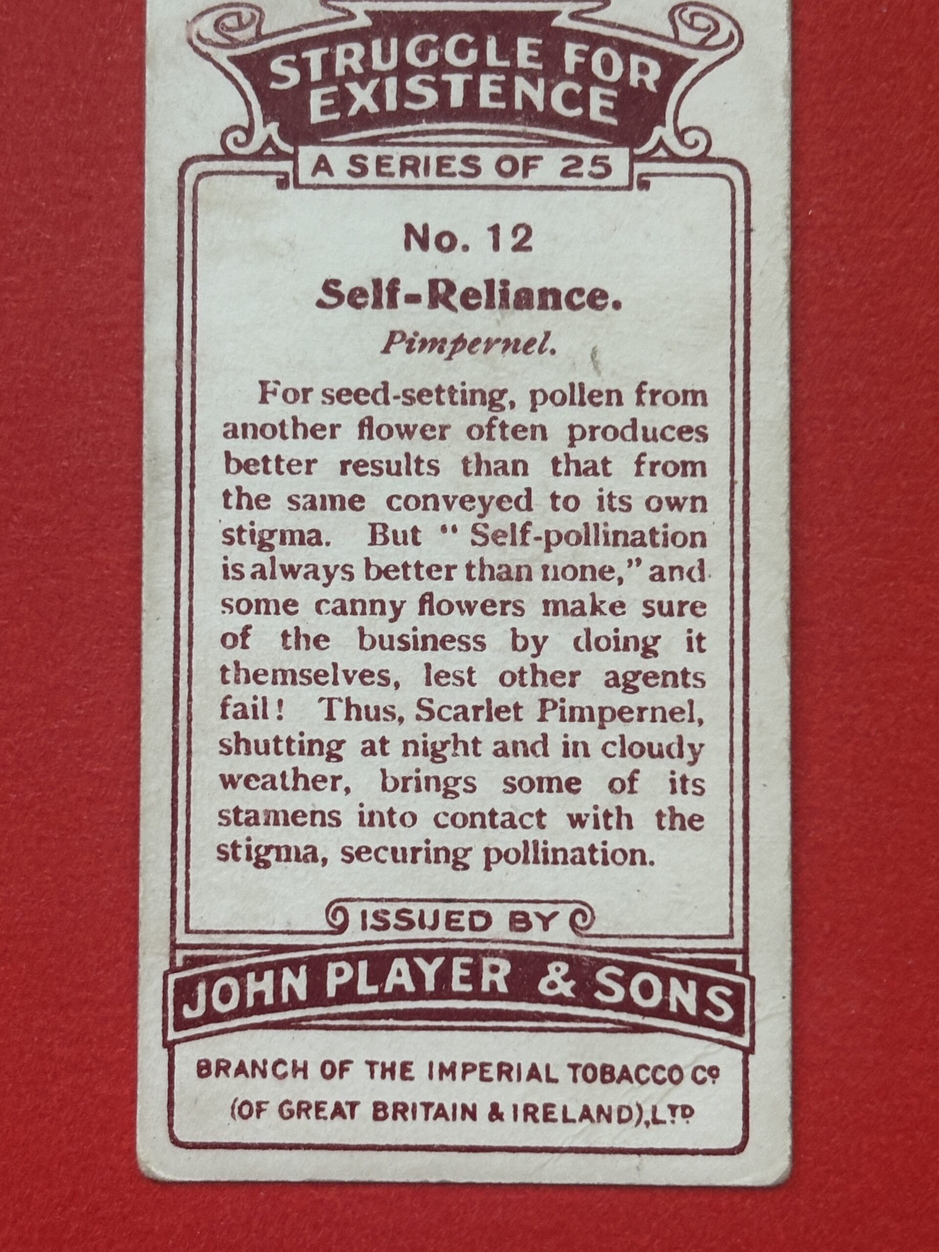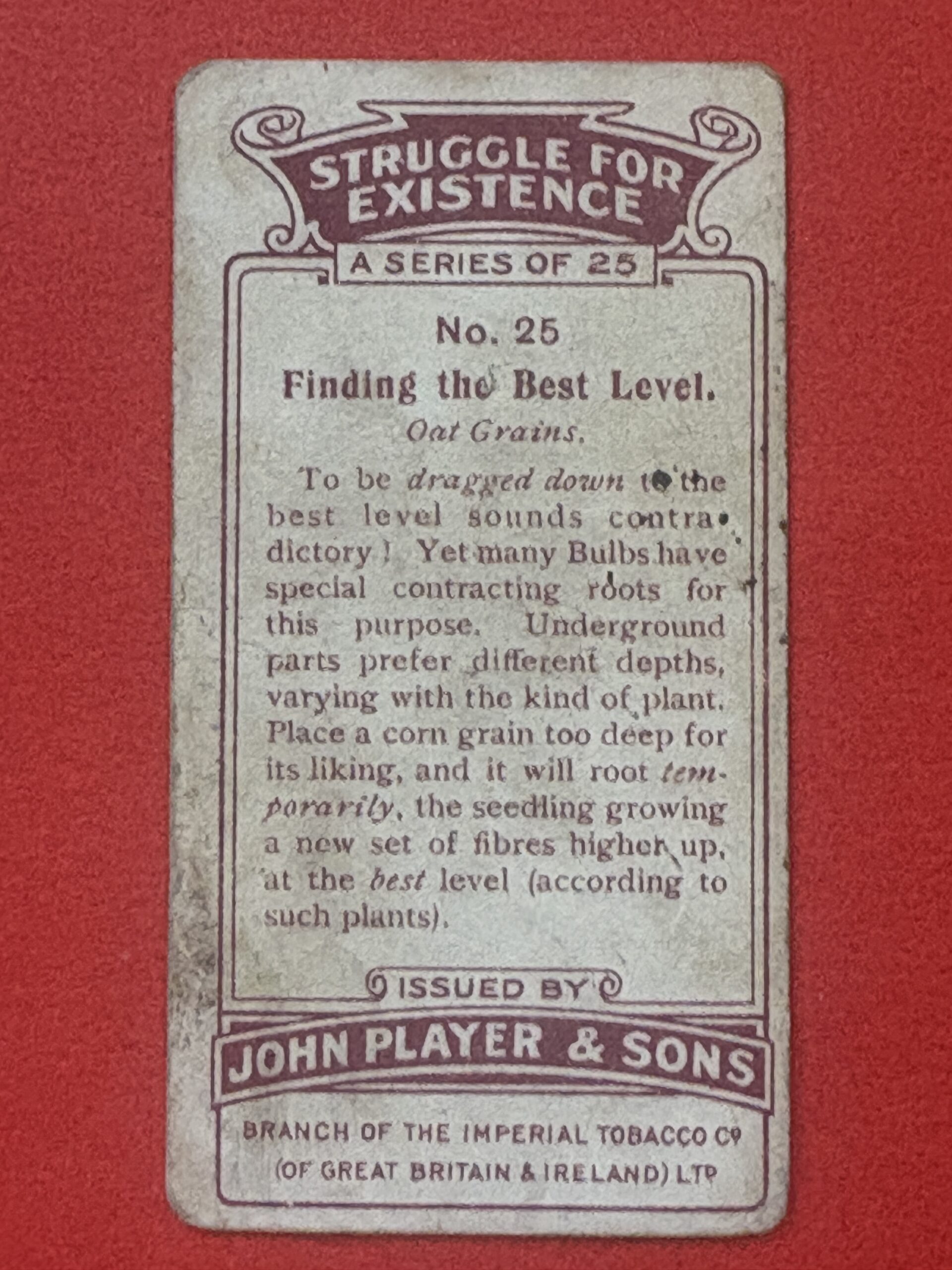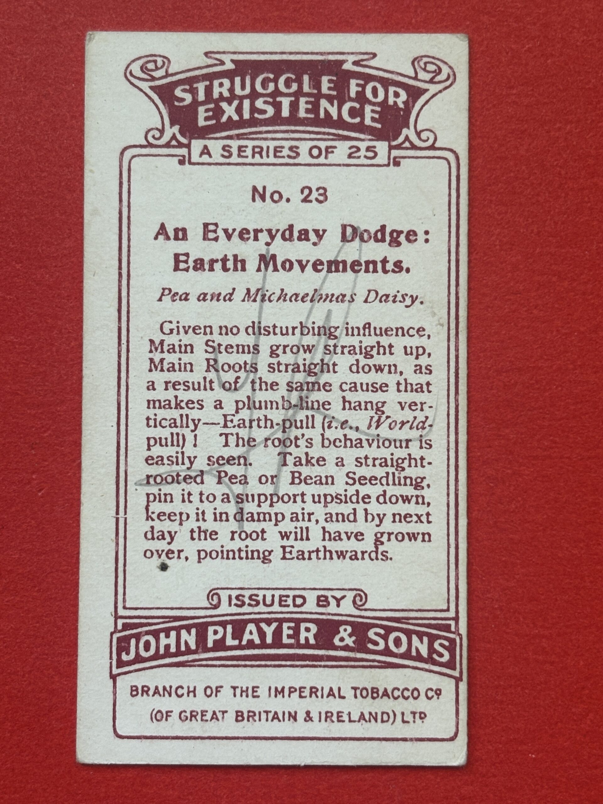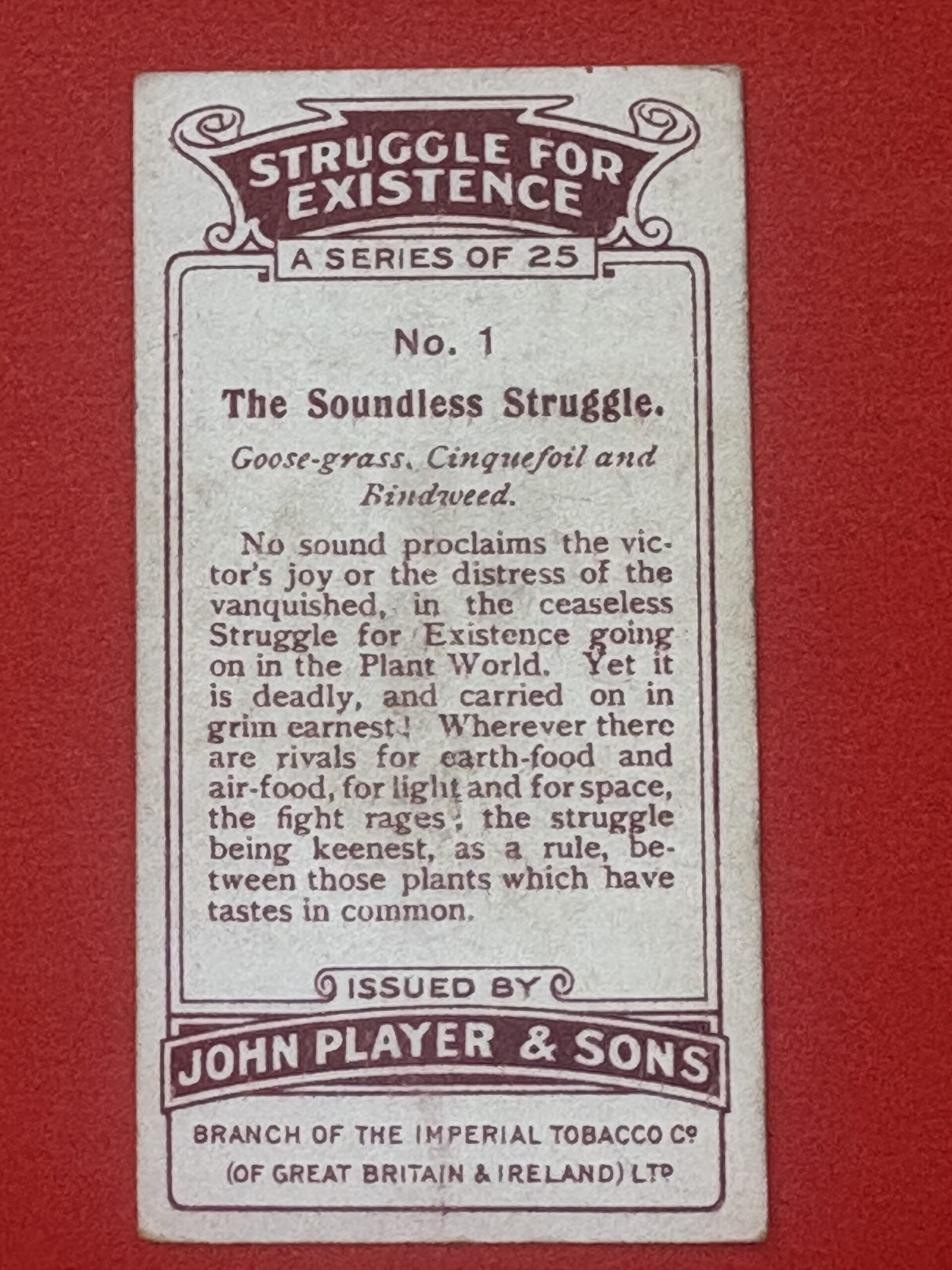 Explore the historical intricacies with our vintage cig card collection featuring the ‘Struggle for Existence’ set. A product of 1923, these tobacco-sized cards are a unique piece of history, each one a single card release by John Player and Sons. They are a tangible connection to the past, showcasing a glimpse of the era’s botanical wonder and the fierce competition inherent in nature, as depicted by the ‘Struggle for Existence’ theme. Collectors and enthusiasts can choose their specific card from the dropdown menu, each one an original piece with its own narrative to tell. Written in English, these cards are a testament to the artistic and historical value of the era, making them a must-have for any serious collector or history aficionado looking to add a piece of the past to their collection.QUALITY AVE TO POOR.CHECK IMAGES FRONT AND BACK.ON MULTIPLE ITEMS FOR SAME CARD,THE WORSE CARD WILL BE SHOWN.CAN SEND PIC OF CARD/S I WILL SEND.